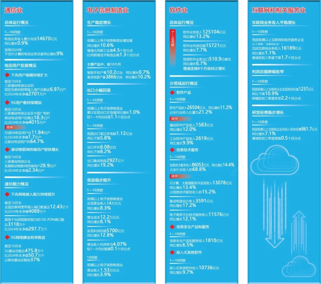 2025年行至岁末,中国经济高质量发展稳健前行。工业和信息化部近日发布的2025年1—10月份通信业、电子信息制造业、软件业及互联网服务业运行数据显示,我国信息通信产业动能澎湃,结构持续优化,展现出强大的发展韧性和创新活力,为培育新质生产力、推动经济转型升级提供了坚实支撑。
