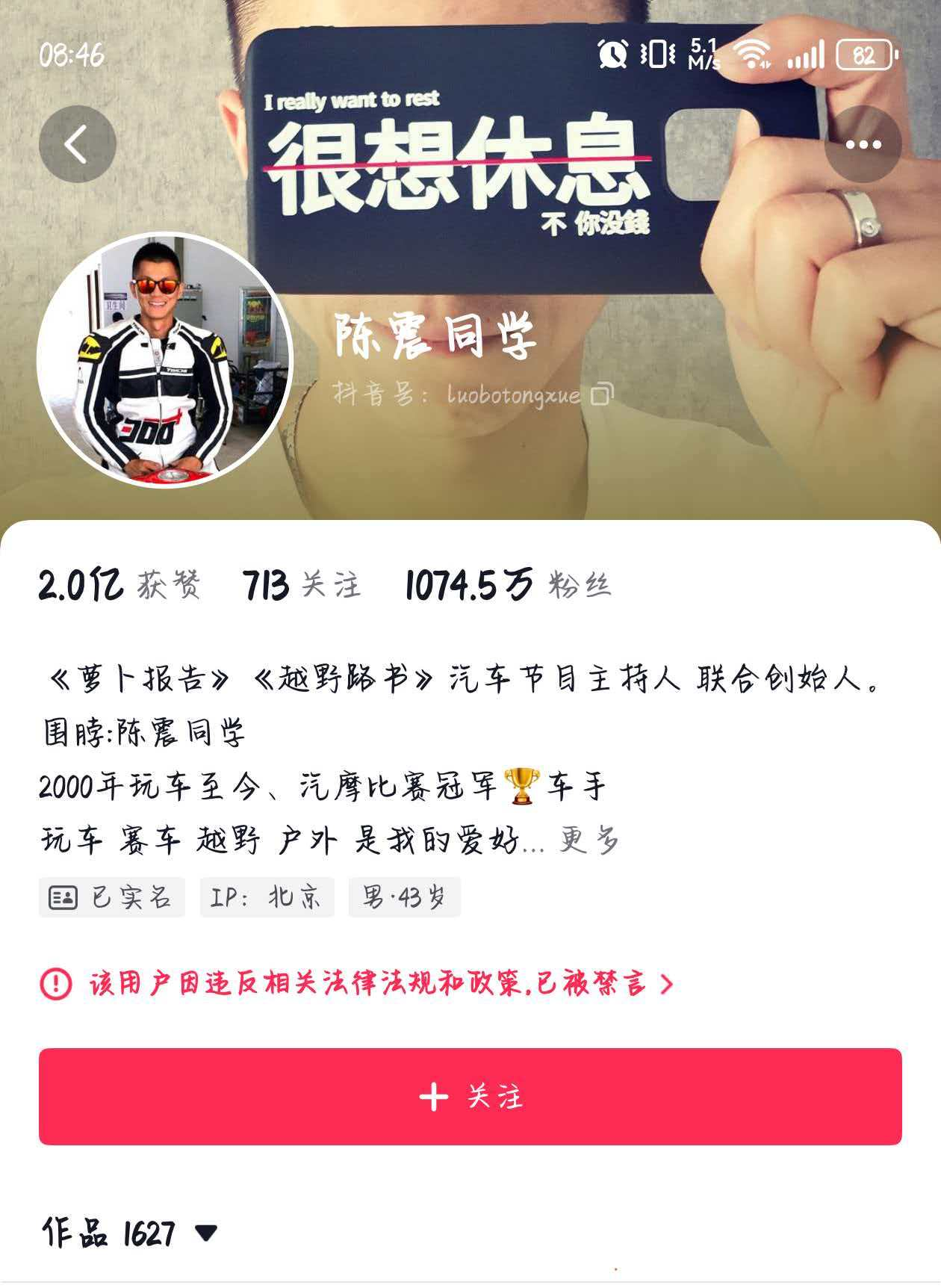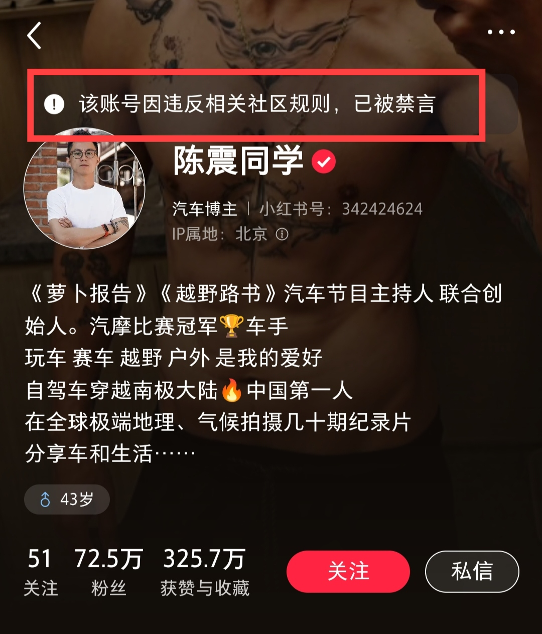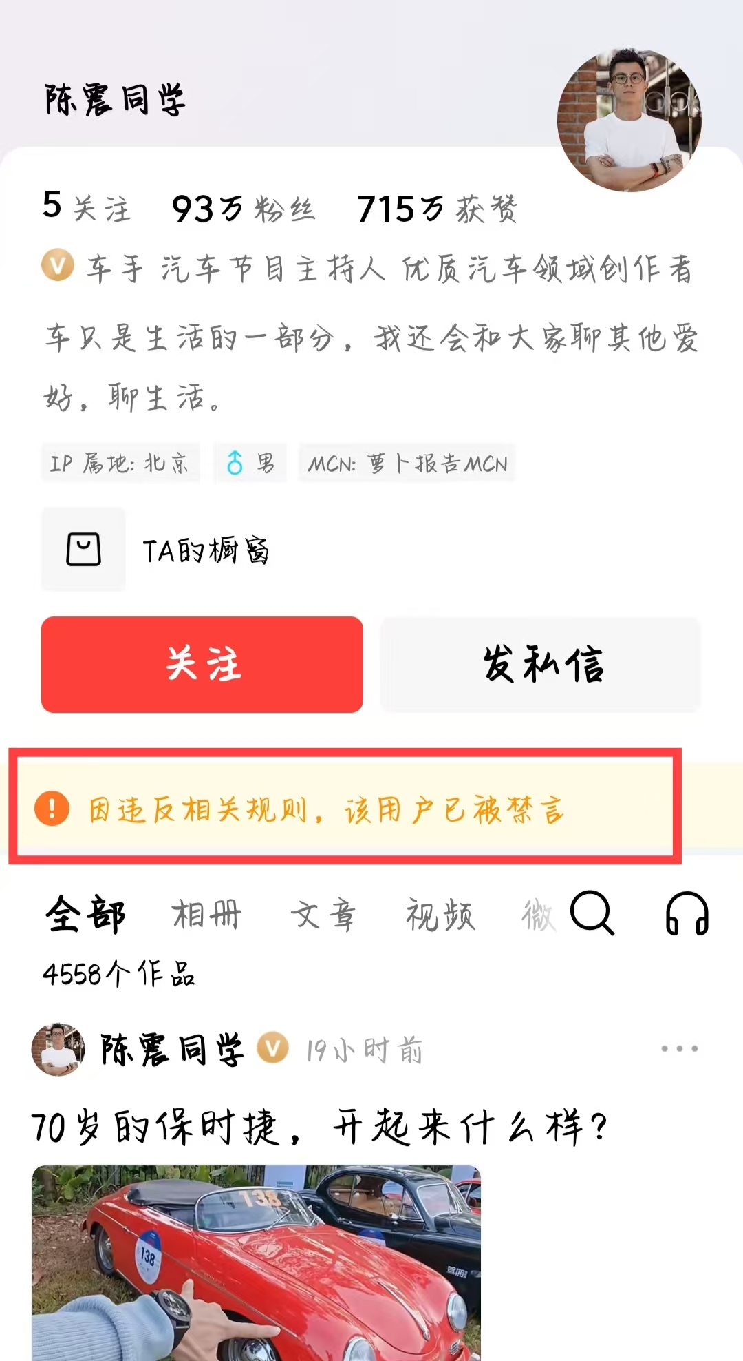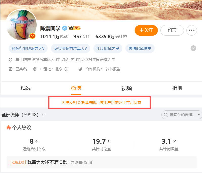 知名车评人陈震多个社交平台账号被禁言 粉丝超2400万