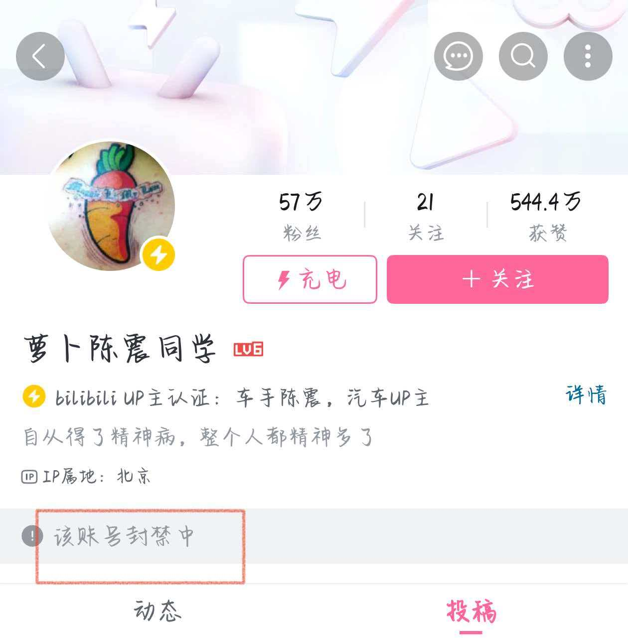 陈震B站账号主页显示,该账号封禁中。