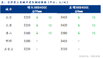价格方面,今日京津冀主流建材市场价格小幅下调为主。