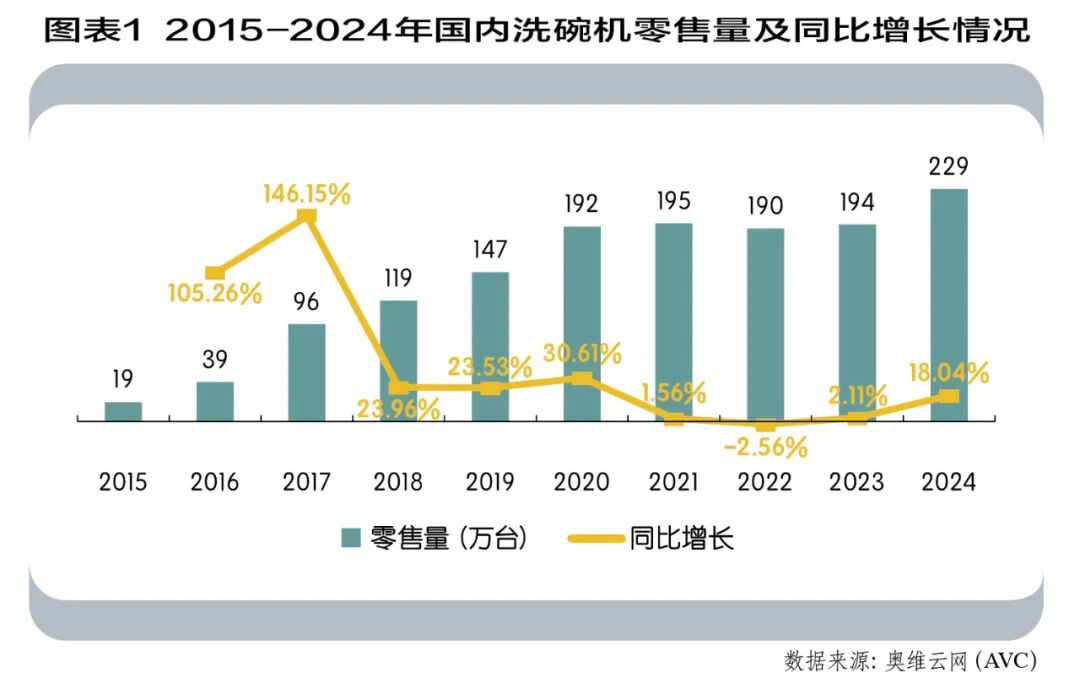 洗碗机作为一种舶来品,直到2011年,美的、老板、方太等本土企业才开始布局这一行业。2015年,国内洗碗机市场迎来高速增长期,2015年-2024年,国内洗碗机零售量从19万台增长至229万台(图表1)。