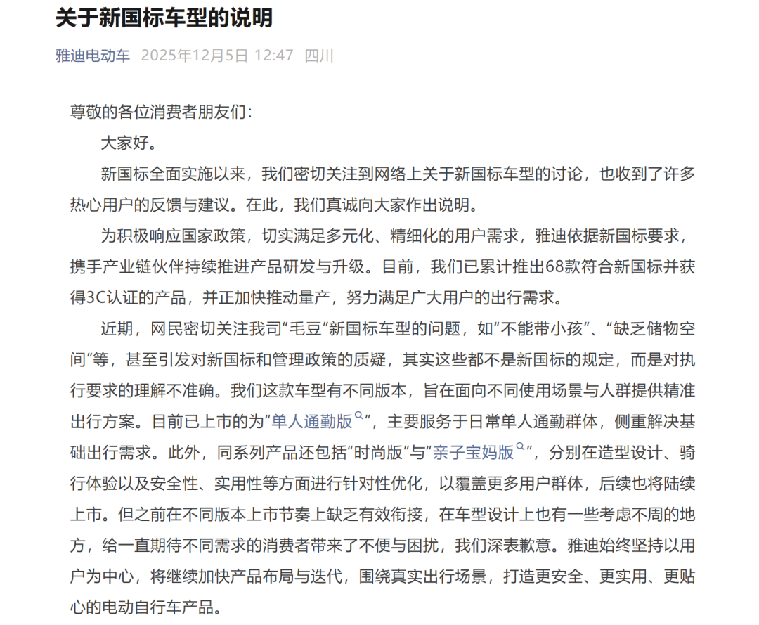 “但之前在不同版本上市节奏上缺乏有效衔接,在车型设计上也有一些考虑不周的地方,给一直期待不同需求的消费者带来了不便与困扰,我们深表歉意。”雅迪通过公众号发文表示,公司将依据新国标要求,与产业链伙伴持续推进产品研发与升级。目前,该公司已累计推出68款符合新国标并获得3C认证的产品,并正加快推动量产,努力满足广大用户的出行需求。