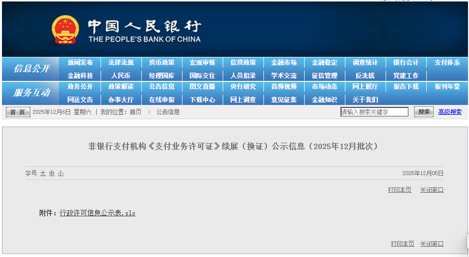 12月5日,央行官网发布非银行支付机构《支付业务许可证》续展(换证)公示信息(2025年12月批次)。
