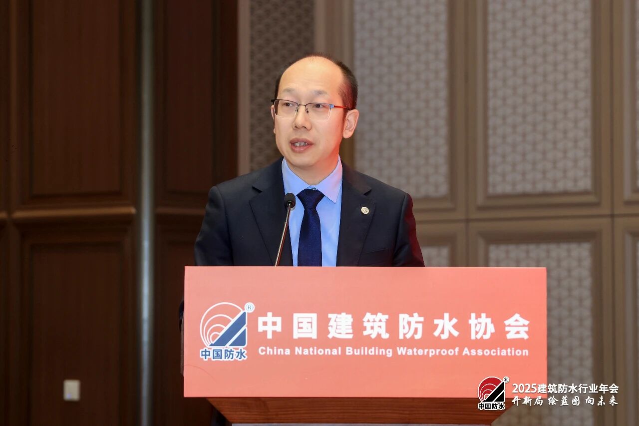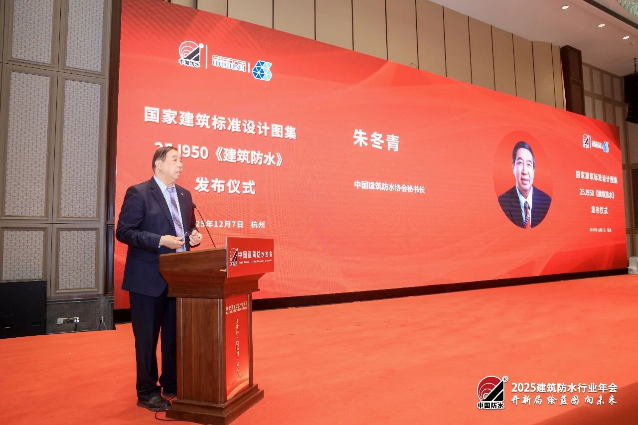 随后,中国建筑防水协会秘书长朱冬青登台致辞,他感谢各方对图集出版的辛劳付出,历经8年得以出版,他强调了标准化图集对规范市场秩序、提升工程质量的核心意义,对国标图集《建筑防水》的编制完成与发布表示热烈祝贺,并期待图集能为行业高质量发展注入强劲动力。