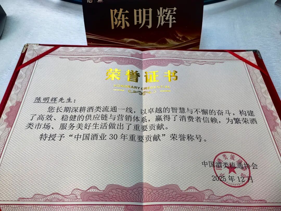 活动期间,名品世家董事长陈明辉荣获“中国酒业30年重要贡献”荣誉称号。这一荣誉不仅是对陈明辉个人三十年来为中国酒业发展所做出杰出贡献的高度认可,更是对名品世家在行业中所发挥引领作用的充分肯定。