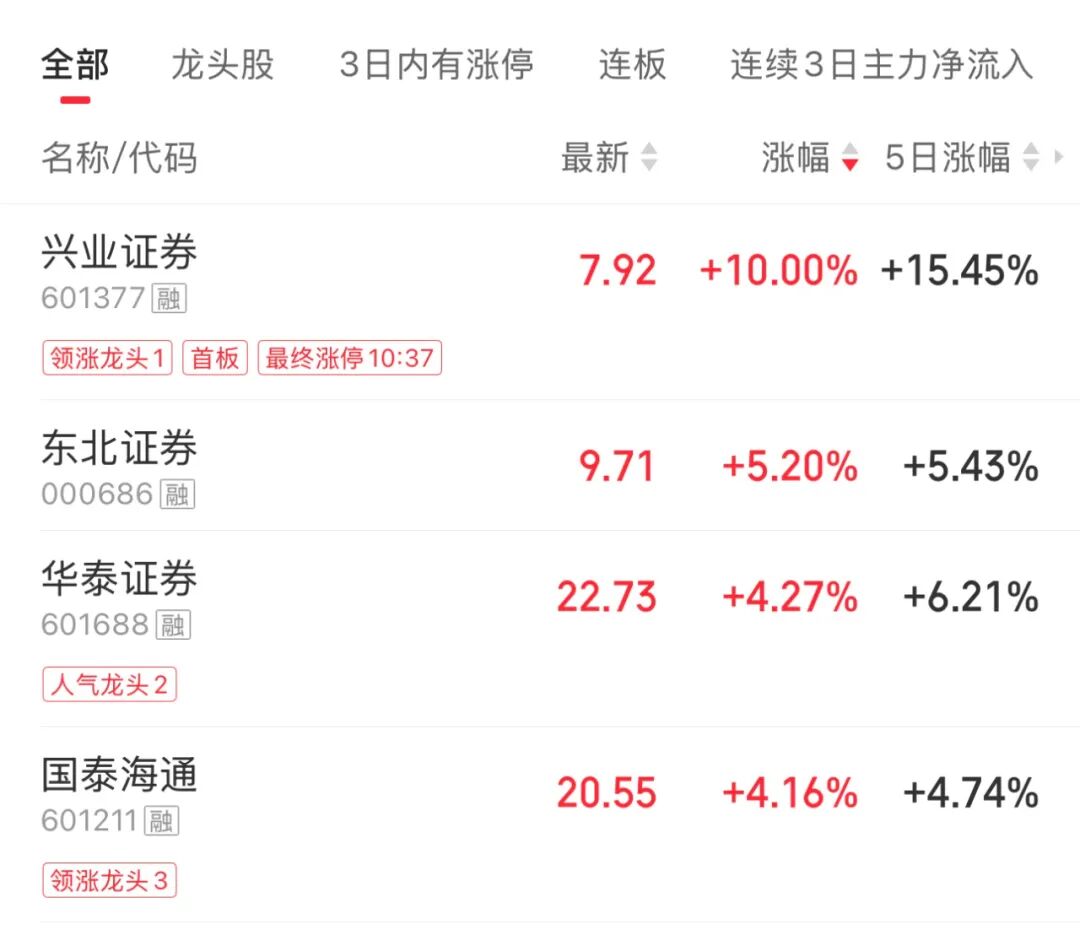 除因并购重组事项停牌的中金公司(601995)、信达证券(601059)、东兴证券外,板块内其余47只个股全线飘红,兴业证券(601377)涨停,半日成交额达47.62亿元;东北证券(000686)涨超5%,华泰证券(601688)、国泰海通(601211)均涨超4%;行业龙头中信证券半日成交额超65亿元。