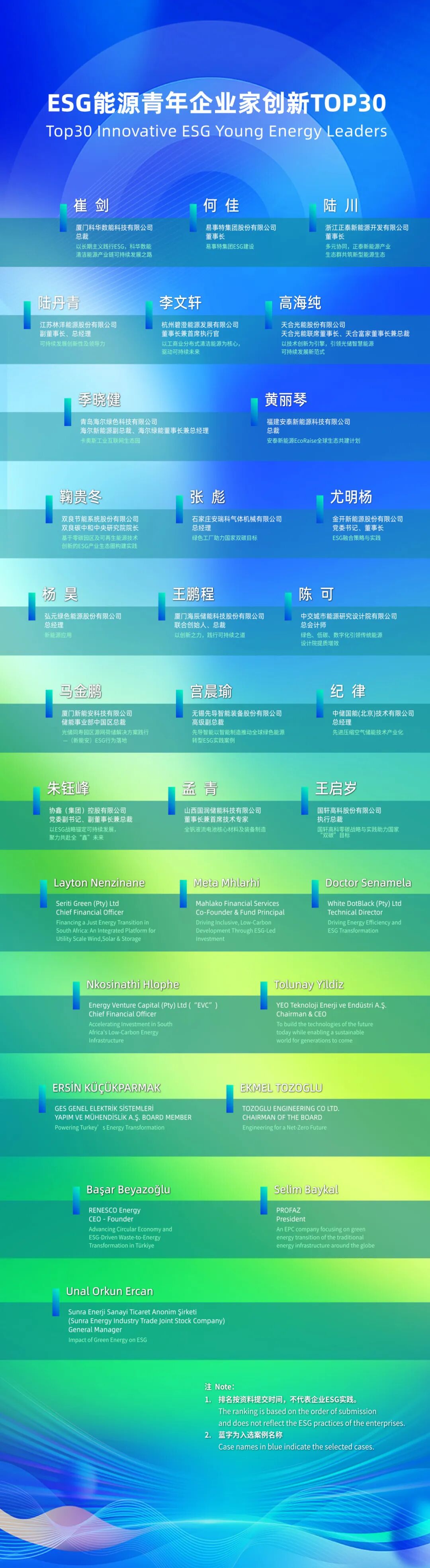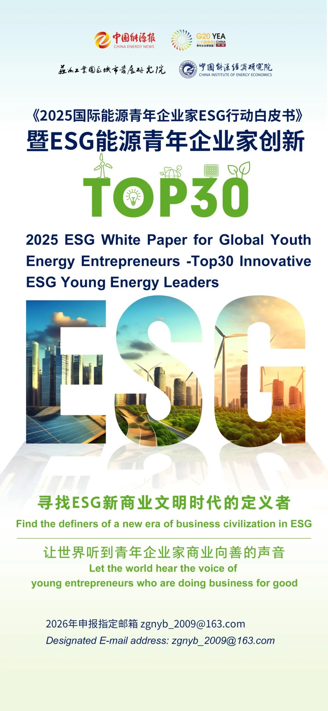 会议期间,由中国能源报、G20青年企业家联盟中国总部、苏州工业园区城市发展研究院、中国能源经济研究院联合发起的ESG能源青年企业家创新TOP30正式发布。国际能源领域青年ESG创新标杆揭晓,旨在发掘并推广青年企业家在能源领域的ESG典型实践,以榜样力量推动更多企业践行绿色低碳可持续发展,助力全球气候治理与能源转型升级。