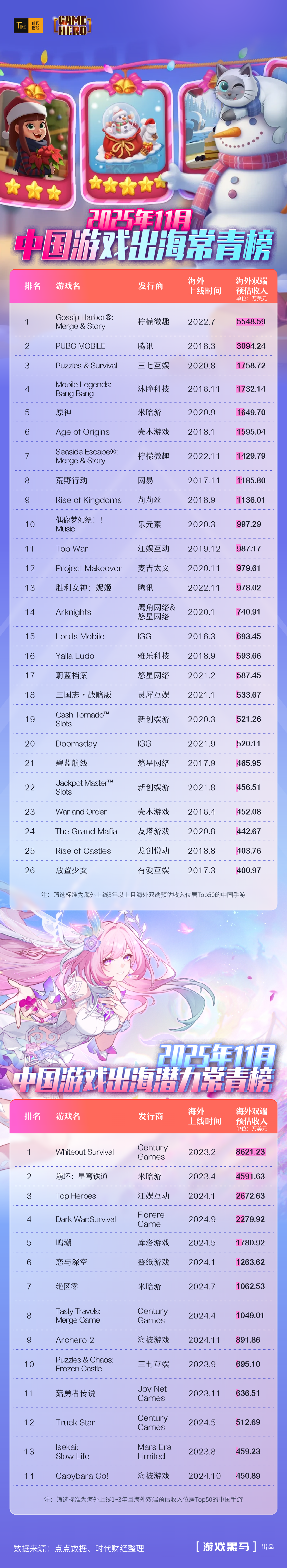 时代财经以海外上线3年以上且海外双端预估收入跻身Top50的中国手游为筛选标准,统计并发布《2025年11月中国游戏出海常青榜》(下称“《出海常青榜》”);同时以海外上线1年至3年且海外双端预估收入跻身Top50的中国手游为标准,统计并发布《2025年11月中国游戏出海潜力常青榜》(下称“《出海潜力常青榜》”)。