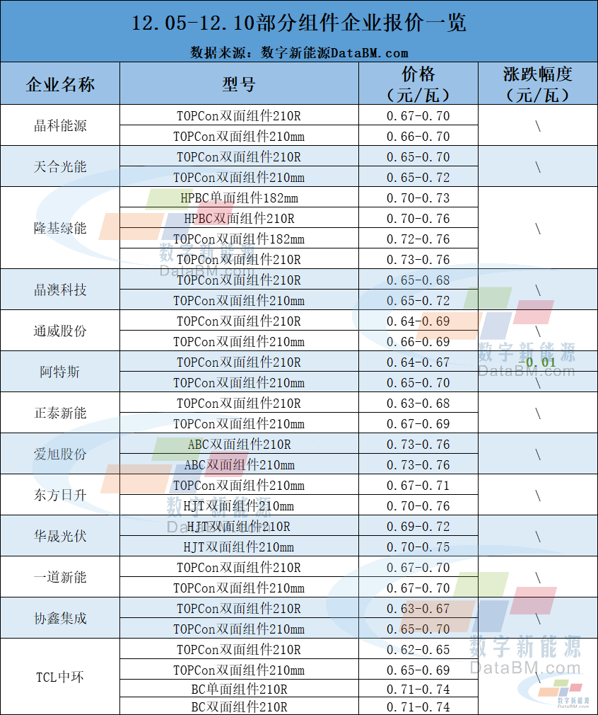TOPCon组件价格小幅下降,主流价格区间维持在0.62-0.72元/W。头部厂商常规产品报价基本稳定,维持在0.66-0.68元/W,但据数字新能源DataBM.com调研,各家头部企业均有百MW规模的特价产品在市场流通,其报价低至0.60-0.63元/W水位。