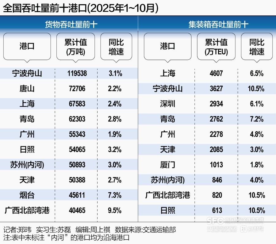 从交通运输部公布的全国主要港口1-10月吞吐量数据看,今年上海港集装箱吞吐量仍然大幅领跑,领先位居第二的宁波舟山港约千万标箱规模,紧随其后的深圳港、青岛港、广州港(601228)、天津港(600717)4座港口集装箱吞吐量相对接近,位列第三梯队。同期,全国集装箱吞吐量前十港口中,宁波舟山港、广西北部湾港(000582)和日照港(600017)3座港口吞吐量实现双位数正增长,增速亮眼。