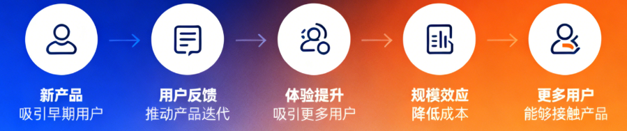 长江商学院的教材中曾给出过相应模型:新产品吸引早期用户 → 用户反馈推动产品迭代 → 体验提升吸引更多用户 → 规模效应降低成本 → 更多用户能够接触产品。这个循环能否转起来,决定了创新的命运。