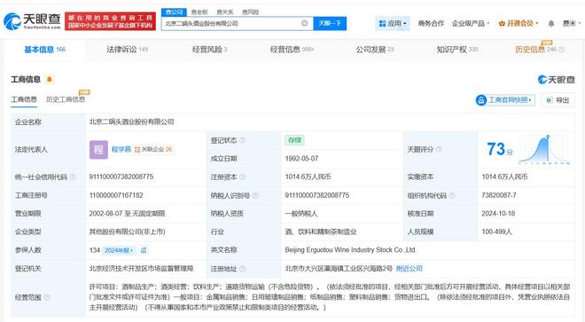 天眼查经营风险信息显示,近日,北京二锅头酒业股份有限公司因违反食品安全法相关规定,被北京经济技术开发区管理委员会罚款10万元。处罚事由显示,该公司存在食品标签未标注“固态法白酒”、未标注警示语、不符合执行标准要求等情形。