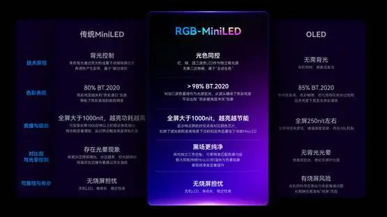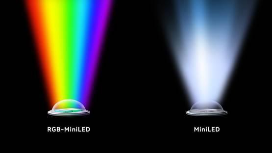 与传统Mini LED不同,RGB-Mini LED并非使用单一的白光或蓝光LED作为背光源。它直接在背光模组中集成了红(R)、绿(G)、蓝(B)三原色的Mini LED芯片。