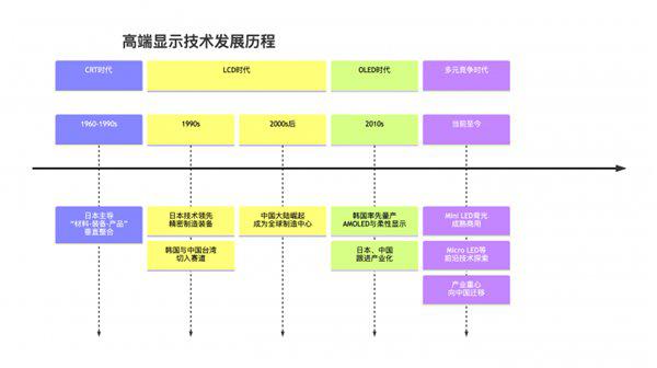 回顾当代显示技术,可以简单划分四个发展历程,分别是CRT时代,LCD时代,OLED时代,后LCD时代(多元竞争时代)。这其中,从最初的CRT阴极射线管时代,到LCD液晶显示时代,是显示技术最为关键的一次技术升级,因为它彻底改变了显示终端的产品形态。然而长期以来,高端显示技术被极少数发达国家控制,在一些尖端显示领域甚至保持极高的技术壁垒,导致前三次显示技术变革中,中国一直是追赶者。