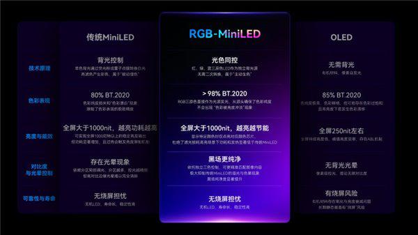 RGB-MiniLED显示技术在传统Mini-LED的基础上,既解决了市面绝大多数LCD屏幕所诟病的色彩不足问题,又避免出现类似OLED屏幕使用寿命相对有限的问题。这项技术的实现,主要来源于以下两个方面的核心突破。