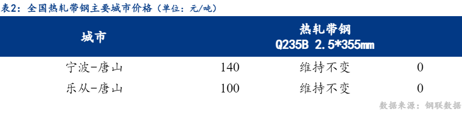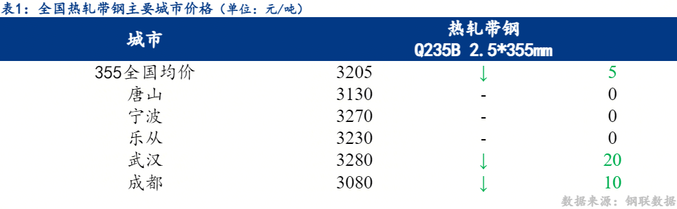 12日热轧带钢全国主要城市价格主稳个降,截至发稿时2.5*355mm热轧带钢均价3205元/吨,较昨降5元/吨,其中2.5*355mm主要城市报价为唐山3130元/吨,宁波3270元/吨,乐从3230元/吨。