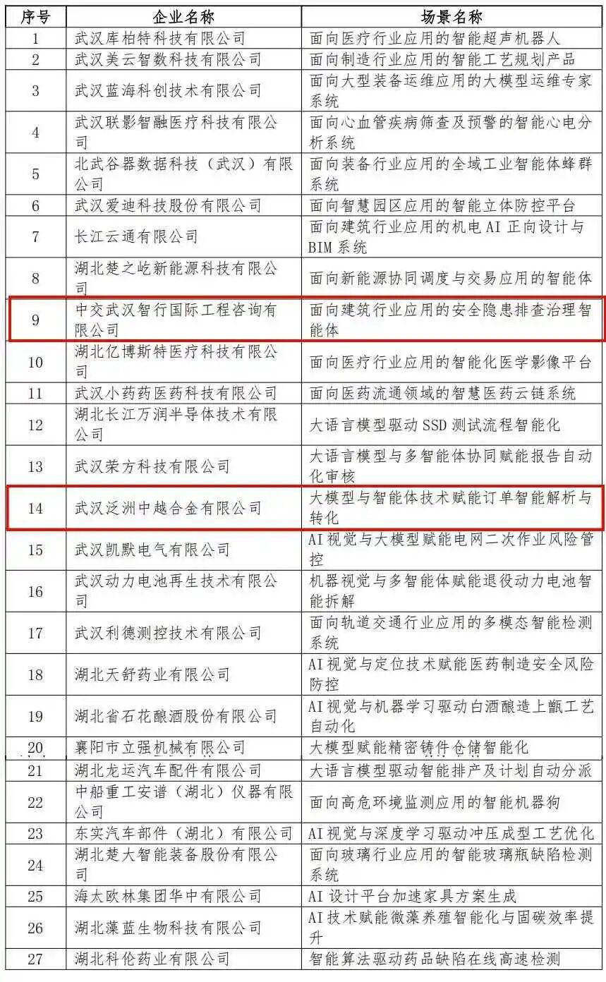 近日,工业和信息化部在优质中小企业梯度培育平台发布2025年全国中小企业人工智能典型应用场景。武汉经开区2个应用场景入选,分别由区内企业武汉泛洲中越合金有限公司、中交武汉智行国际工程咨询有限公司打造。