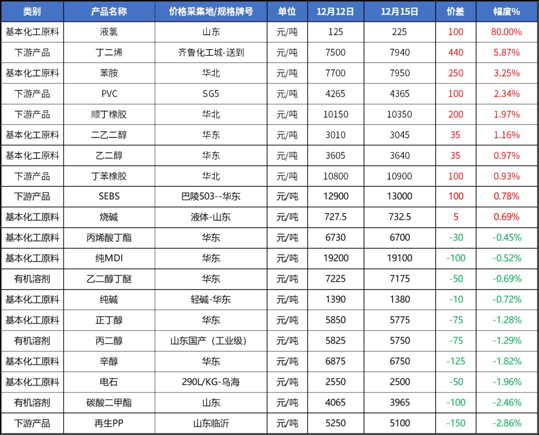 在卓创资讯(301299)监测的109个产品之中,本周期有29个产品上涨,占比26.61%;58个产品持稳,占比53.21%;22个产品下降,占比20.18%。上涨的前三名产品为液氯、丁二烯、苯胺,涨幅分别80.00%、5.87%、3.25%;下跌前三名产品为再生PP、碳酸二甲酯、电石,跌幅分别为2.86%、2.46%、1.96%。