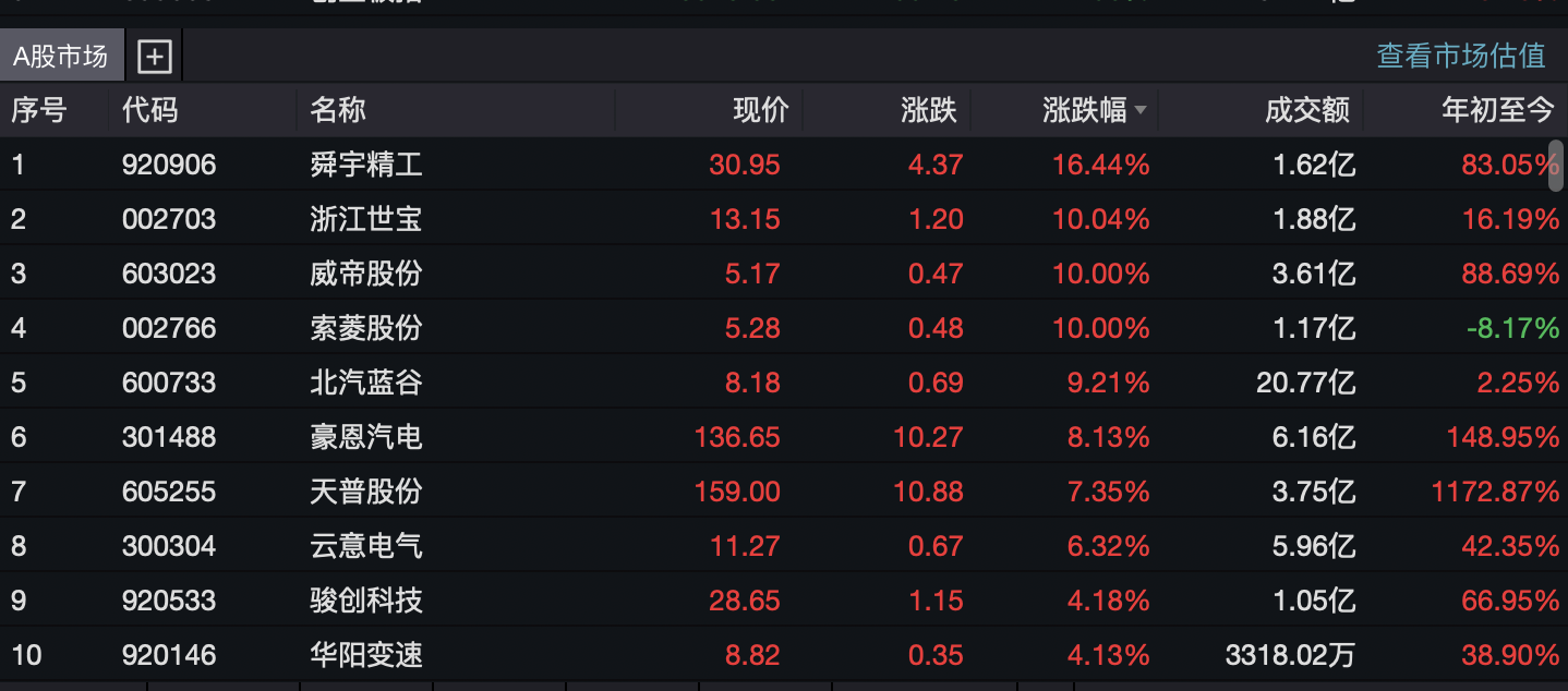 具体来看,资讯数据显示,汽车与零部件板块多股大涨,截至记者发稿时,成分股中浙江世宝(002703)、威帝股份(603023)、索菱股份(002766)3股涨停,舜宇精工涨超16%,豪恩汽电(301488)、北汽蓝谷(600733)、天普股份(605255)等多股跟涨,北汽蓝谷逼近涨停。