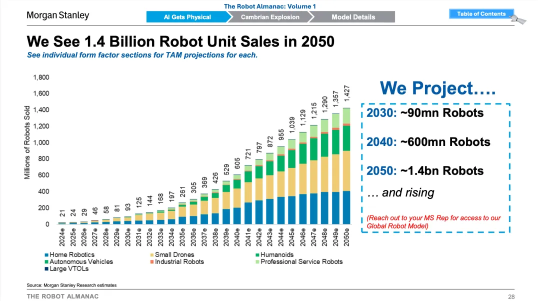 摩根士丹利通过其全球机器人模型(GROM)预测,到2050年全球将销售14亿台机器人,运行中的机器人总数将达到65亿台。机器人形态将高度多样化,包括工业机器人、服务机器人、无人机、自动驾驶车辆、类人机器人、家用机器人等,覆盖从制造业到医疗、农业、交通、国防、空间探索等各类应用场景。