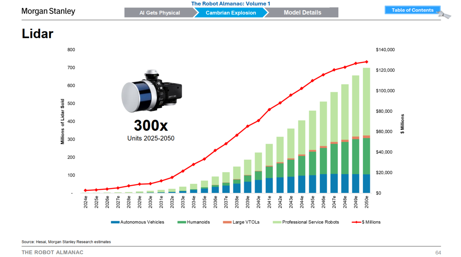 摩根士丹利预测,到2050年,为满足14亿台机器人对环境感知的需求,全球激光雷达的需求量将达到约7亿颗,较2025年需求规模将增长近300倍,释放出极具想象空间的长期市场机遇。