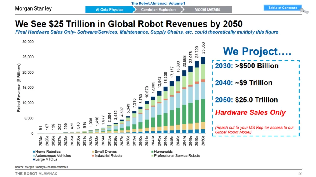 全球机器人硬件销售额将从2025年的约1000亿美元激增至2030年的5000亿美元,2040年达到9万亿美元,并在2050年攀升至25万亿美元。这一预测仅涵盖硬件销售,若加上软件服务、维护及供应链相关收入,市场规模可能成倍增长。