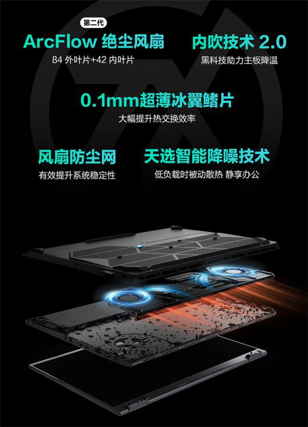 散热系统是实现这一体验的关键:机型采用升级后的冰川散热系统,配备两个第二代 ArcFlow 绝尘风扇(0.1mm 超薄冰翼鳍片)与内吹技术 2.0,将传统“向外吹热风”的风道改为“向内灌凉风”,冷空气直接导向 CPU、GPU 区域,散热效率显著提升;同时风扇支持逆转除尘技术,定期排出风道内灰尘,避免长期使用后散热能力衰减。