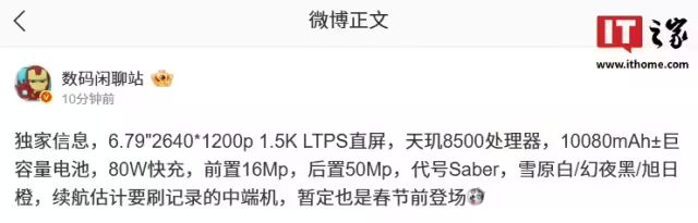 先是在上午,微博博主发文透露,某厂天玑8500处理器中端新机内置10080mAh±巨容量电池,支持80W快充,暂定春节前登场。