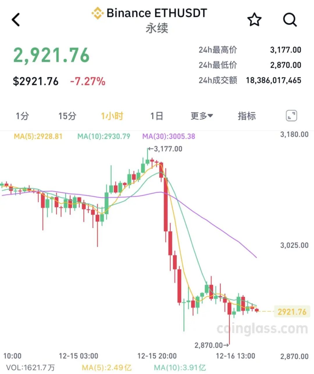 以太坊一度跌破2900美元/枚,现跌超7%。