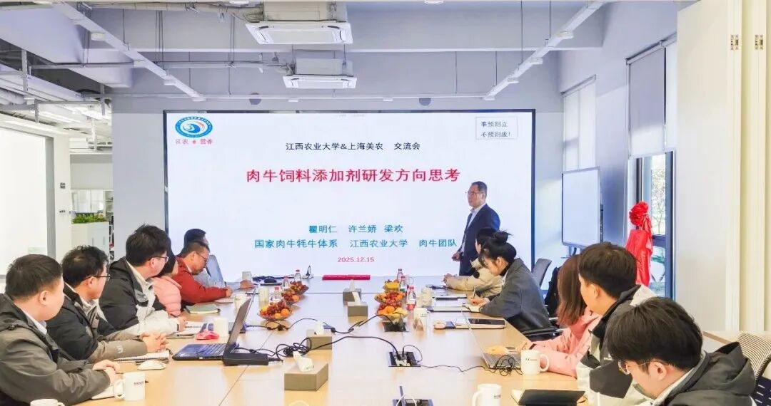 2025年12月15日,美农生物(301156)与江西农业大学共建教授工作站揭牌仪式在苏州美农圆满举行。江西农业大学瞿明仁教授团队、美农生物董事长兼总经理洪伟先生、苏州美农总经理王继红女士、美农反刍产品事业部温世宝先生及反刍研发部门成员共同参与本次大会,以产学研深度融合为纽带,以布局肉牛市场为目标,携手开启肉牛饲料添加剂领域创新研发的全新征程。