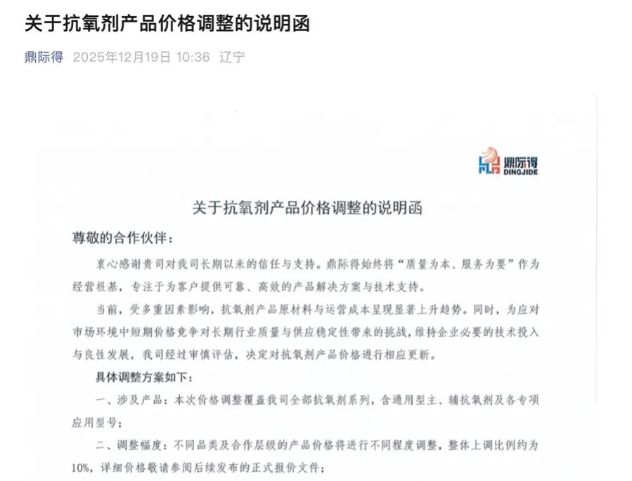 12月19日,鼎际得(603255)(603255.SH)在官方渠道发布关于抗氧剂产品价格调整的说明函,宣布对公司全部抗氧剂系列产品价格进行更新,整体上调比例约为10%,新价格自发布之日起生效。