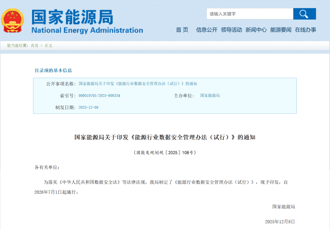 《管理办法》划定了能源数据安全的监管责任边界: