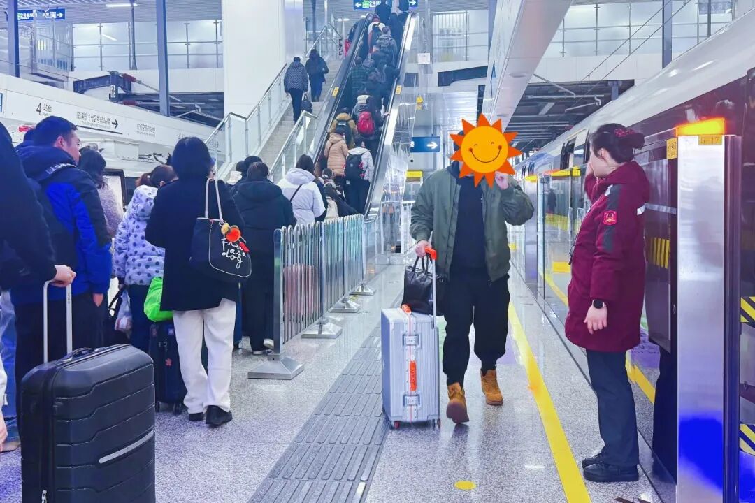 针对4+4重联编组列车运营特点,车站与列车服务进一步细化。站台工作人员及志愿者会在高峰时段加强引导,协助乘客快速辨识列车编组;每个编组配备随车站务员1名(列巡),实现车内动态服务回应乘客关切。此外,考虑到4+4编组列车上线运营期间,环境温度较低,车站进一步加强了设施设备的巡检力度,提前排查并防范因低温可能引发的运行风险,确保运营安全有序。
