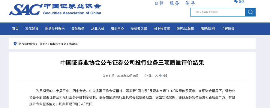 12月30日,中证协同时发布了2025年证券公司投行业务三项质量评价结果——投行业务质量评价、债券业务执业质量评价以及财务顾问业务执业质量评价。评价周期均为2024年1月1日至12月31日。