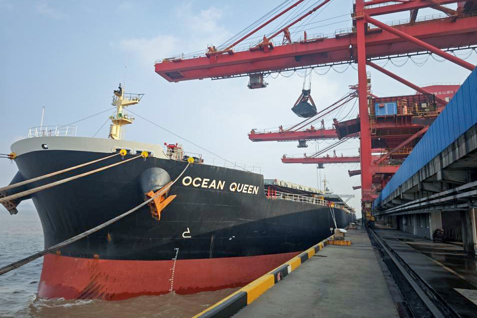 图为“MV OCEAN QUEEN”号货轮载运13.6万吨澳洲动力煤靠泊浙江舟山六横码头