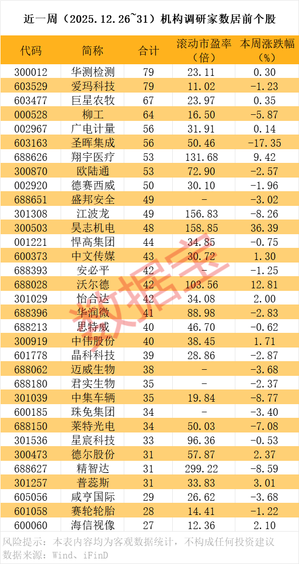 近一周机构调研个股有200多只,华测检测(300012)调研机构数最多。