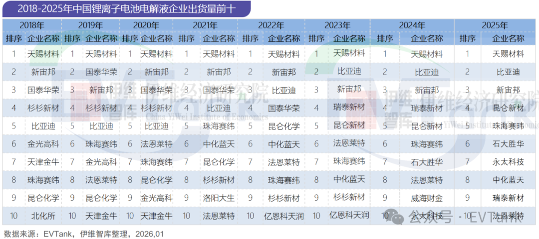 从主要企业来看,天赐材料(002709)以72万吨的出货量排名第一,其市场份额提升至32.2%,已经连续十年排名全球第一。2025年出货量同比增速较快的企业包括石大胜华(603026)、永太科技(002326)、昆仑新材和珠海赛玮,四家企业的出货量同比增速均超过70%,大幅跑赢行业增速。2025年度前十企业中,昆仑新材上升一位排名行业第四,瑞泰新材(301238)和法恩莱特的出货量排名下滑较为明显。