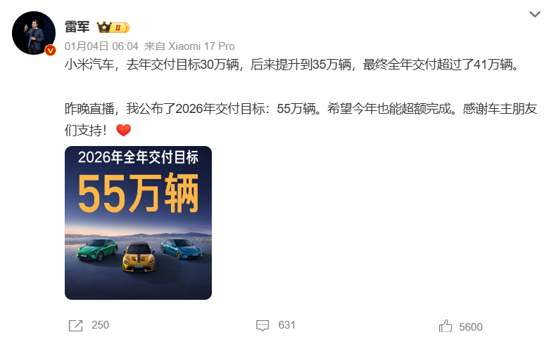 销量飘红的同时,雷军也给2026年定了新目标:全年交付55万辆。