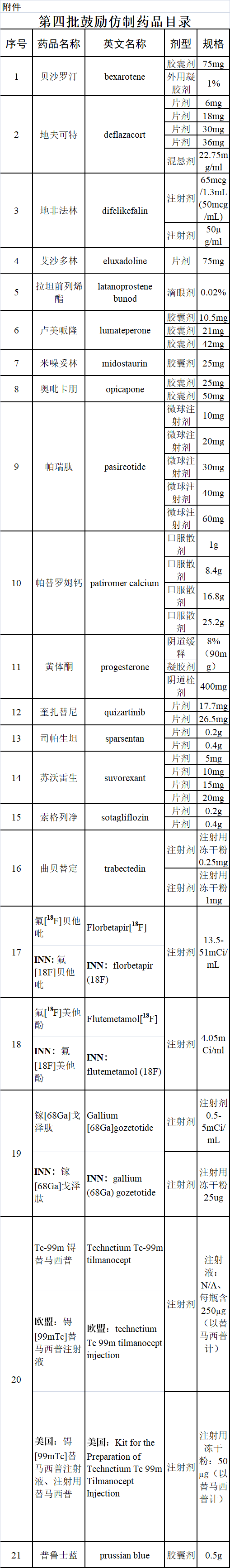 第四批目录收录21个品种、47个品规,继续以患者治疗需求为导向,补短板、强弱项。一是针对我国企业研发薄弱环节,优先收录新靶点、新作用机制产品。如缓解血液透析患者慢性肾病相关中重度瘙痒的地非法林;4个境内未上市放射性药品,涵盖治疗、诊断和定位用药。二是考虑有效性基础上,优先收录境外已进入一线指南推荐的产品。如治疗失眠的苏沃雷生,主要解决入睡难、睡不长问题,也减少白天嗜睡和疲劳的不良反应,可以弥补我国已上市药品不足,为临床提供更多选择。三是围绕促进生育政策,优先选择不良反应低的迭代产品。如用于辅助生殖的黄体酮阴道缓释凝胶剂和栓剂,可以缓解其油溶性注射液在辅助生殖体外受精—胚胎移植技术支持过程中,因长期大剂量注射带来的注射部位红肿、硬结、疼痛和脂膜炎等不良反应。四是考虑用药可及性同时,优先选择国内已有临床实践的产品。如治疗罕见病杜氏肌营养不良的地夫可特。