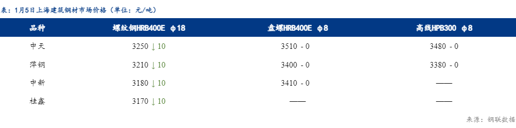 1月5日,上海建筑钢材市场小幅下跌,成交较上一日有所减少。中天螺纹钢3250元/吨,较上一日跌10元/吨;盘螺3510元/吨,较上一日平;高线3480元/吨,较上一日平。