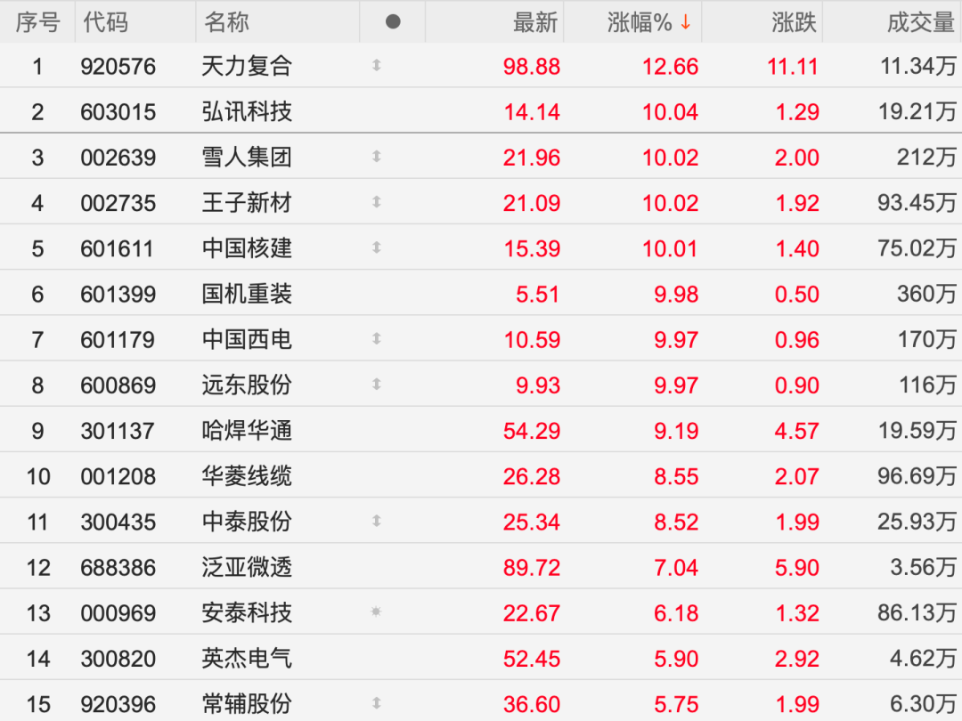 1月7日开盘,可控核聚变概念股震荡走强。截至午间收盘,弘讯科技(603015)(603015.SH)、雪人集团(002639)(002639.SZ)、王子新材(002735)(002735.SZ)、中国核建(601611)(601611.SH)、国机重装(601399)(601399.SH)、中国西电(601179)(601179.SH)、远东股份(600869)(600869.SH)等多只股票涨停,天力复合(920576.BJ)、哈焊华通(301137)(301137.SZ)、常辅股份(920396.BJ)、泛亚微透(688386.SH)等多只股票涨幅居前,市场对可控核聚变技术商业化前景的乐观情绪可见一斑。