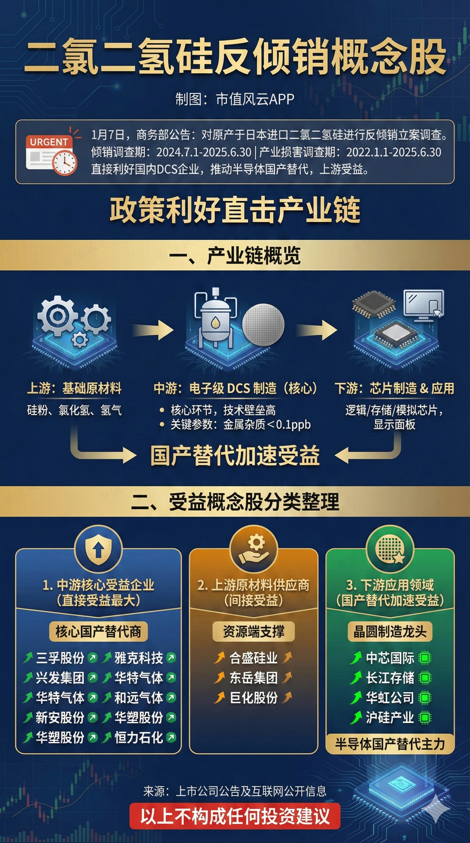 本次反倾销立案调查将直接利好国内二氯二氢硅(DCS)生产企业,同时推动下游半导体制造企业加速国产替代,上游原材料供应商也将间接受益。