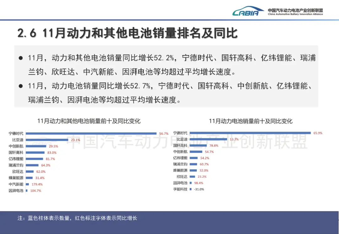 其中,宁德时代(300750)、比亚迪(002594)、中创新航分别位居当月动力和其他电池销量前三,宁德时代、比亚迪、国轩高科(002074)则分别位居当月动力电池销量前三。