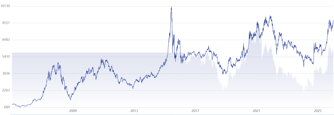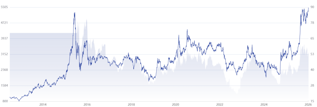 再以中证高端制造主题指数(930820)为例,指数也处于近些年相对高位。不过还没跨越2022年、2015点历史最高点,比人工智能的历史点位水平低一些。