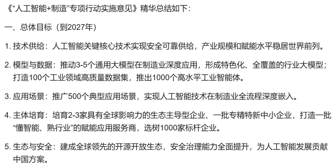 提出到2027年,推动3-5个通用大模型在制造业深度应用,打造100个工业领域高质量数据集,推广500个典型应用场景。