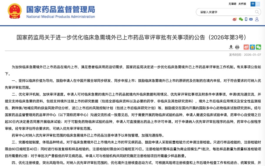 1月7日,国家药监局网站发布《关于进一步优化临床急需境外已上市药品审评审批有关事项的公告》。其中明确,鼓励临床急需境外已上市的原研药及仿制药在境内申报,对于符合要求的可纳入优先审评审批范围。