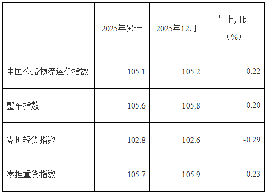 2025年12月份,由中国物流与采购联合会和林安物流集团联合调查的中国公路物流运价指数为105.2点,环比回落0.22%,同比去年回落0.70%。从月内看,第一、二、三周运价指数环比回落。第四周运价指数环比回升。