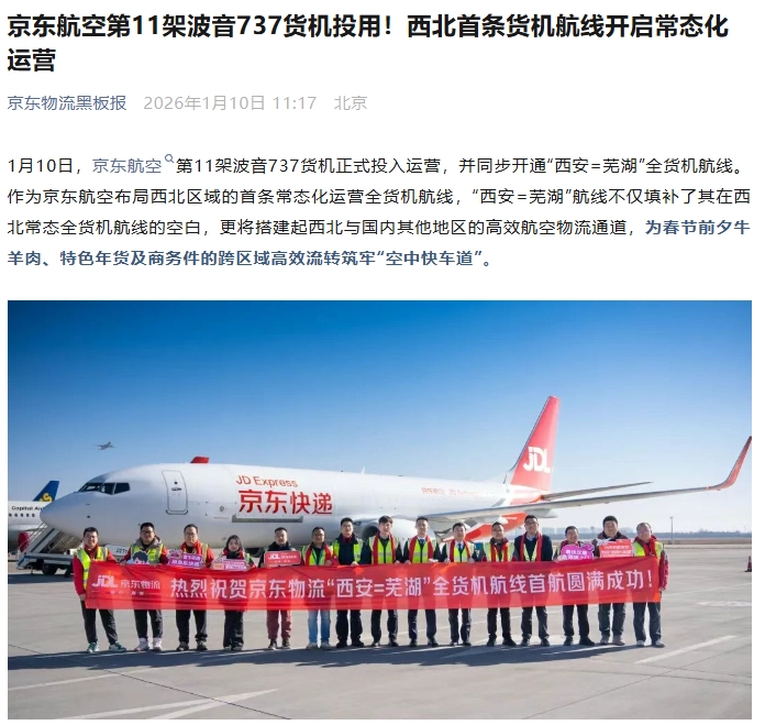 IT之家1月10日消息,京东物流今日宣布,京东航空第11架波音737货机正式投入运营,并同步开通“西安=芜湖”全货机航线。