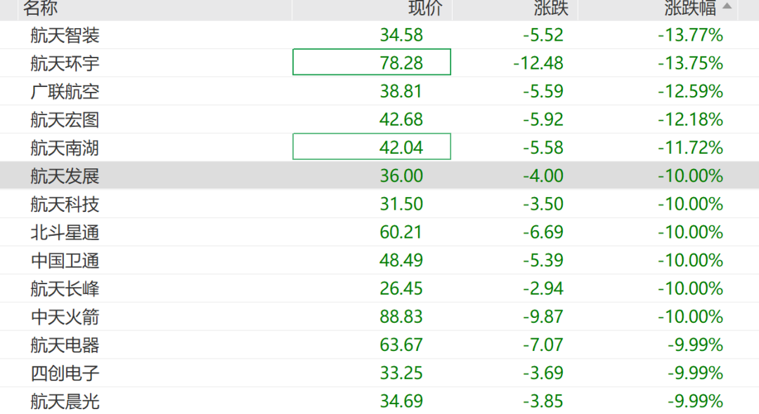 1月13日早盘,商业航天概念股跳水,航天环宇跌超12%,航天宏图、航天智装(300455)跌逾10%,北斗星通(002151)、中国卫通(601698)、航天电器(002025)跌停。