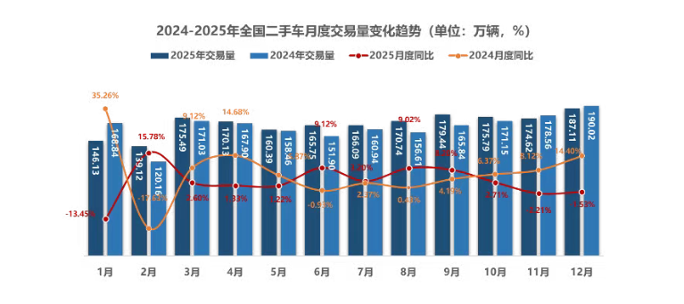 1月13日,中国汽车流通协会数据显示,2025年12月,全国二手车市场交易量187.11万辆,环比增长7.15%,同比下降1.53%,交易金额为1206.72亿元。2025年1—12月,二手车累计交易量2010.80万辆,同比增长2.52%,累计交易金额为12897.90亿元。2025年二手车市场交易规模突破2000万辆大关,创历史新高。